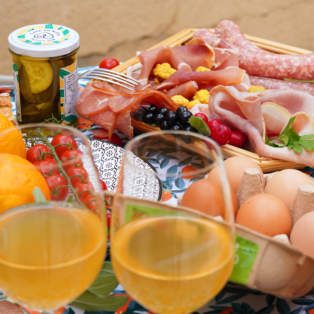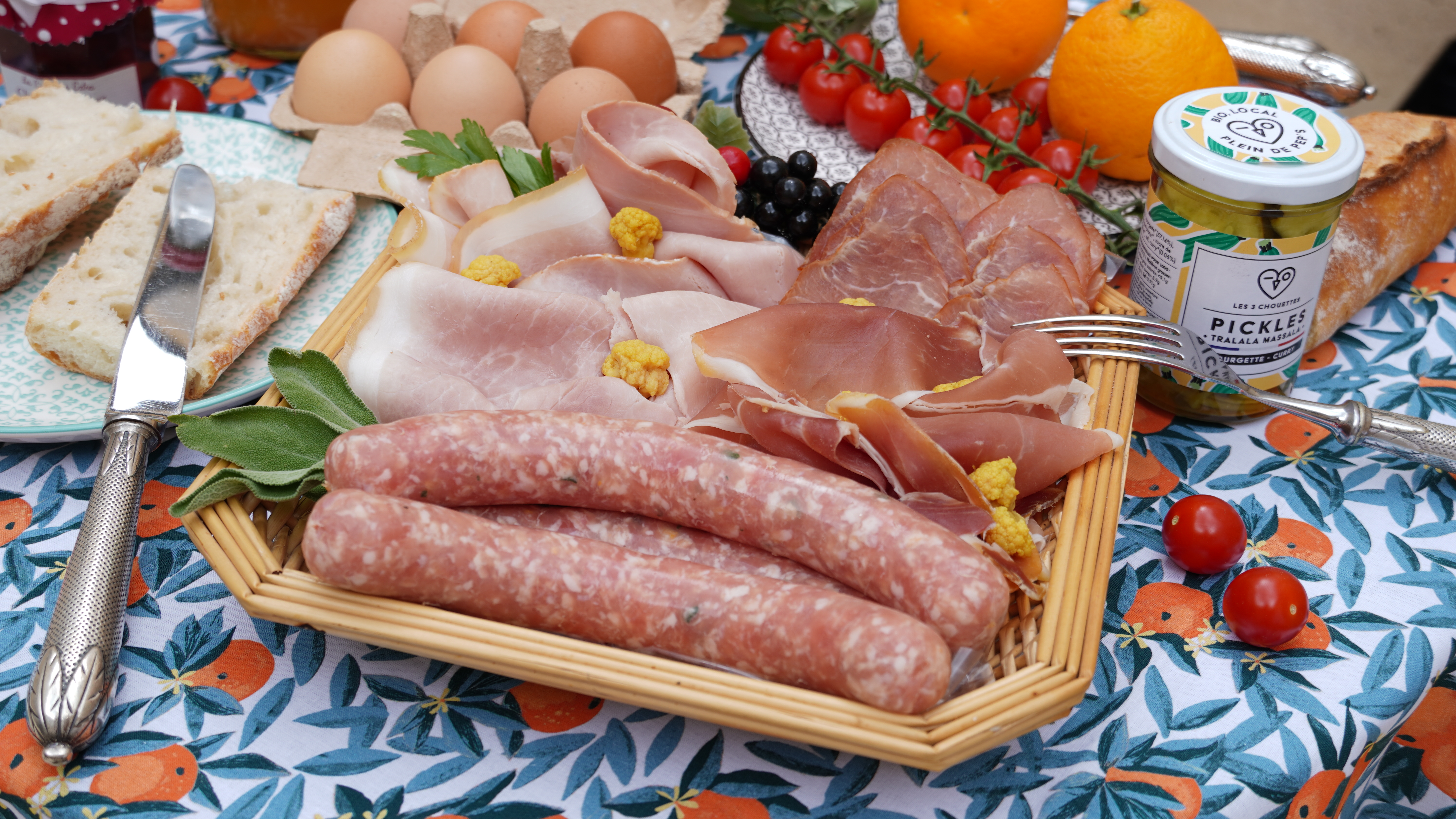 Notre brunch est composé de tranches de jambon braisé, de bacon et de jambon séché maison ainsi que de saucisses légères de volaille au citron confit et à la sauge.