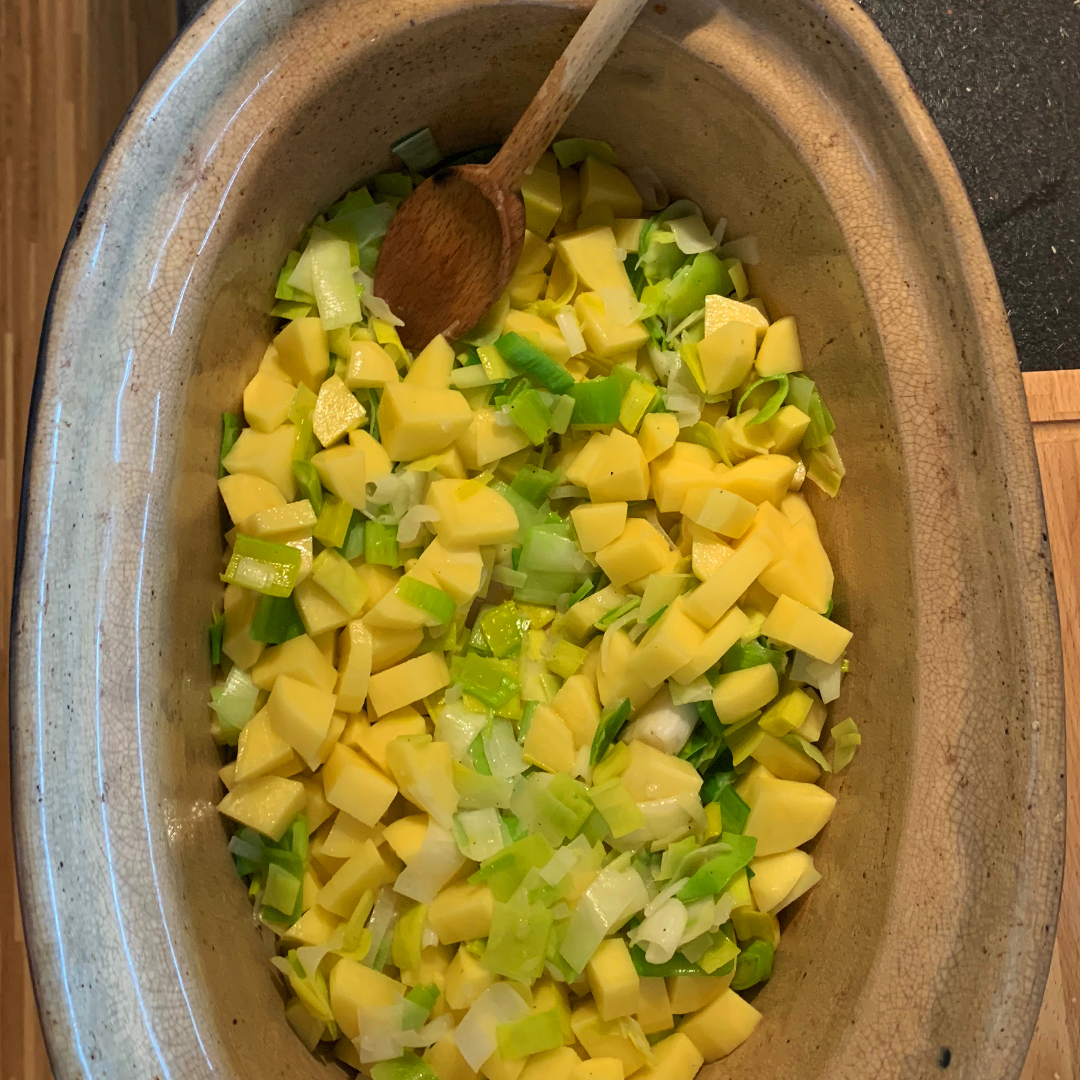 Dans la terrine à baeckeofe, mettez les rondelles de pommes de terre crues, les poireaux et les oignons, puis mélangez. Ajoutez le jus et les truffes hachées, salez et poivrez.