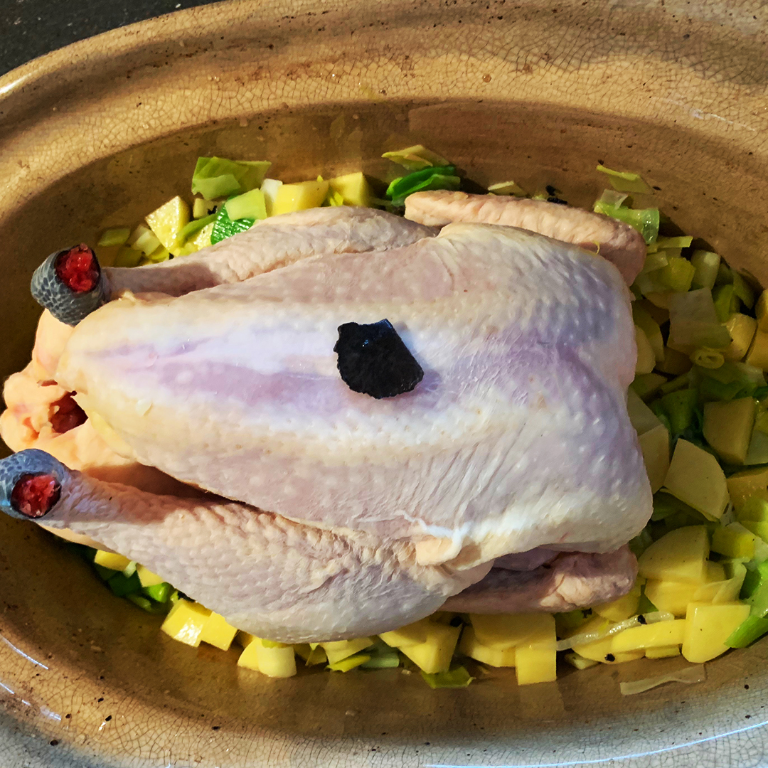 Placez la poularde sur le dessus, versez le fond de volaille et le vin blanc.