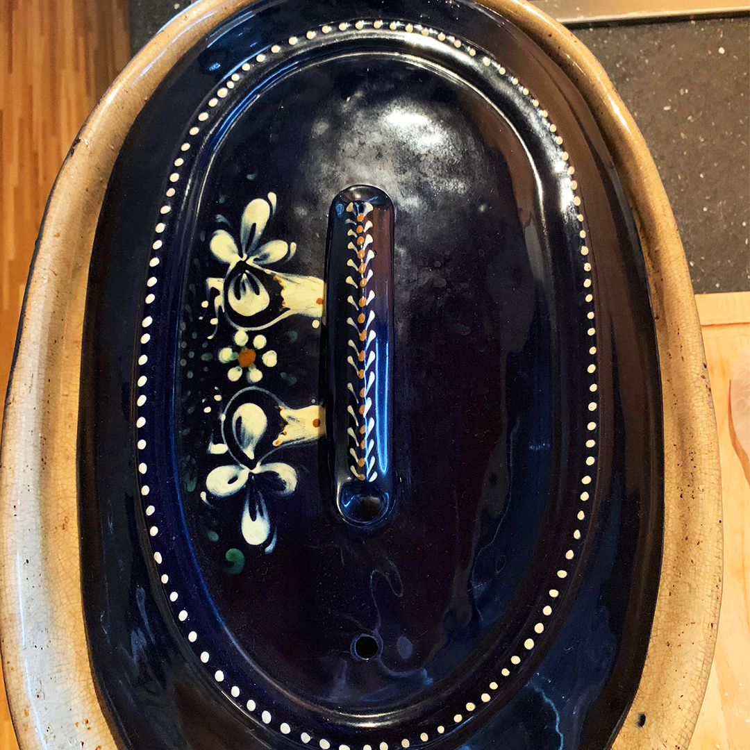 Le baeckeofe est un plat traditionnel alsacien à base de pommes de terre, de légumes et de viandes (porc, agneau, bœuf etc) accompagné d'épices et d'un vin blanc du vignoble d'Alsace. La particularité de ce plat est qu'il est cuit dans une terrine à baeckeofe. Cette terrine est de fabrication artisanale et made in Alsace; en terre cuite et souvent de forme ovale. Elle permet de faire mijoter vos plats à l'étouffée sur plus de 24 heures.