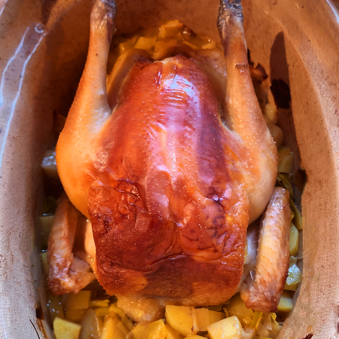 Ensuite retirez la terrine du four et laissez reposer 10 min. Découpez la poularde et servez les légumes en accompagnement.