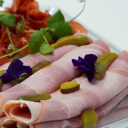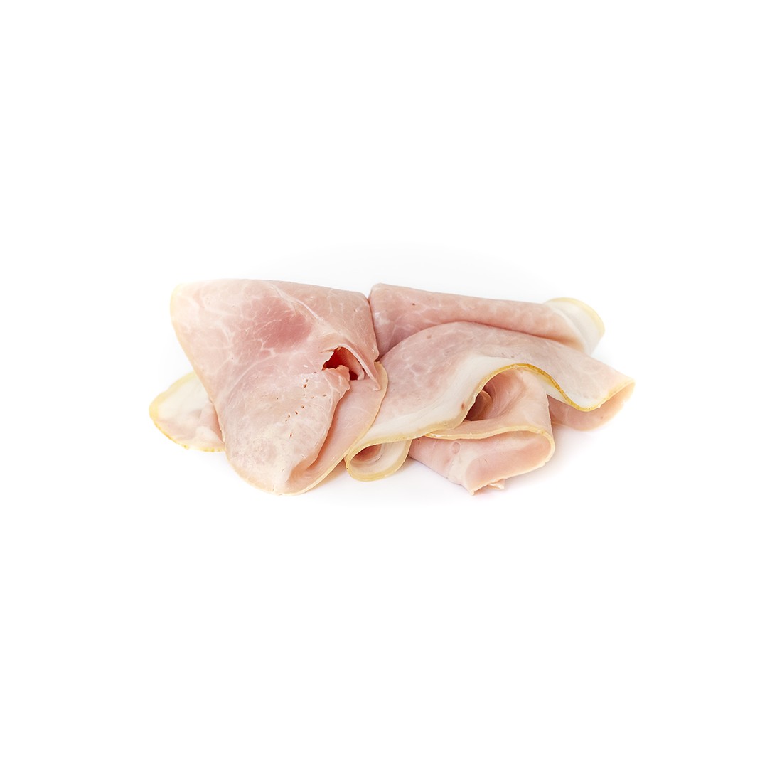 Notre jambon cuit avec sa couenne braisé dans notre fumoir. Sans polyphosphate !