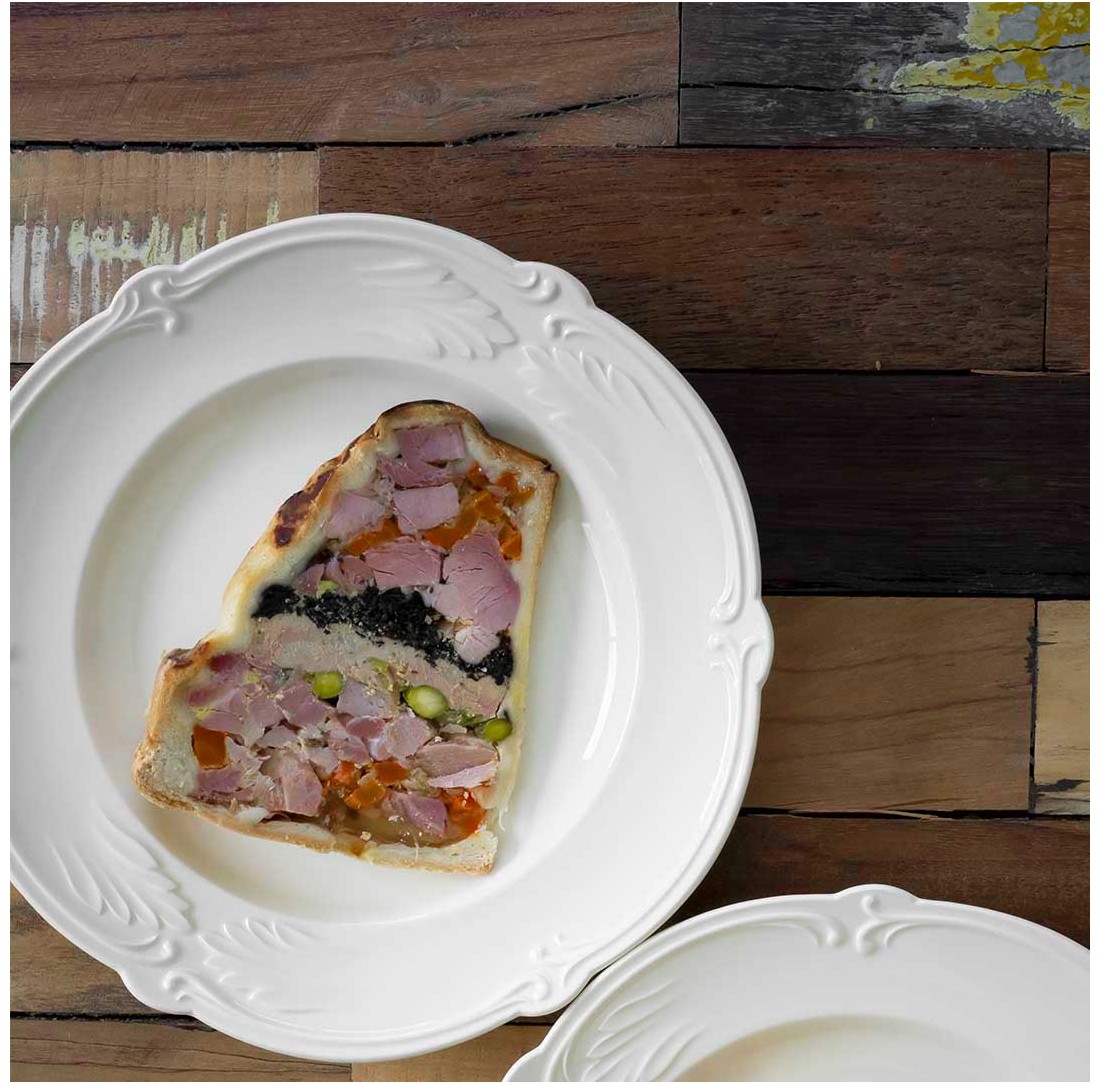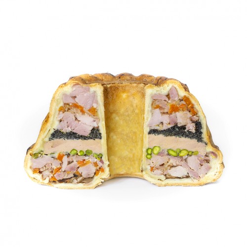 Dans un moule à kouglof, porcelet, foie gras de canard, trompettes des Maures, carottes, pistaches.